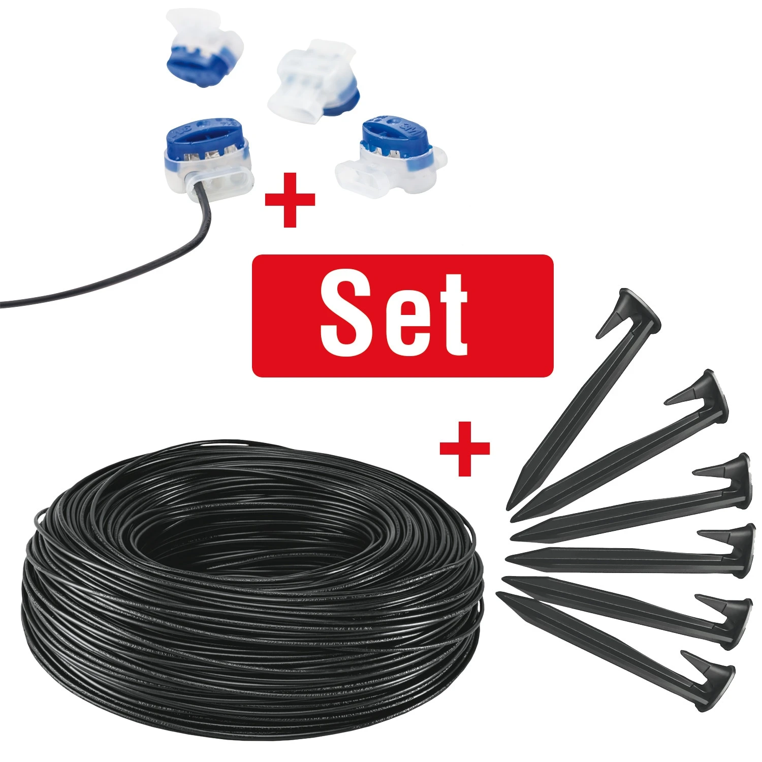 Komplettes Verlegeset für AL-KO Mähroboter bestehend aus 150 m Schleifendraht, 90 Stück Bodennägel und 10 Kabelverbinder.