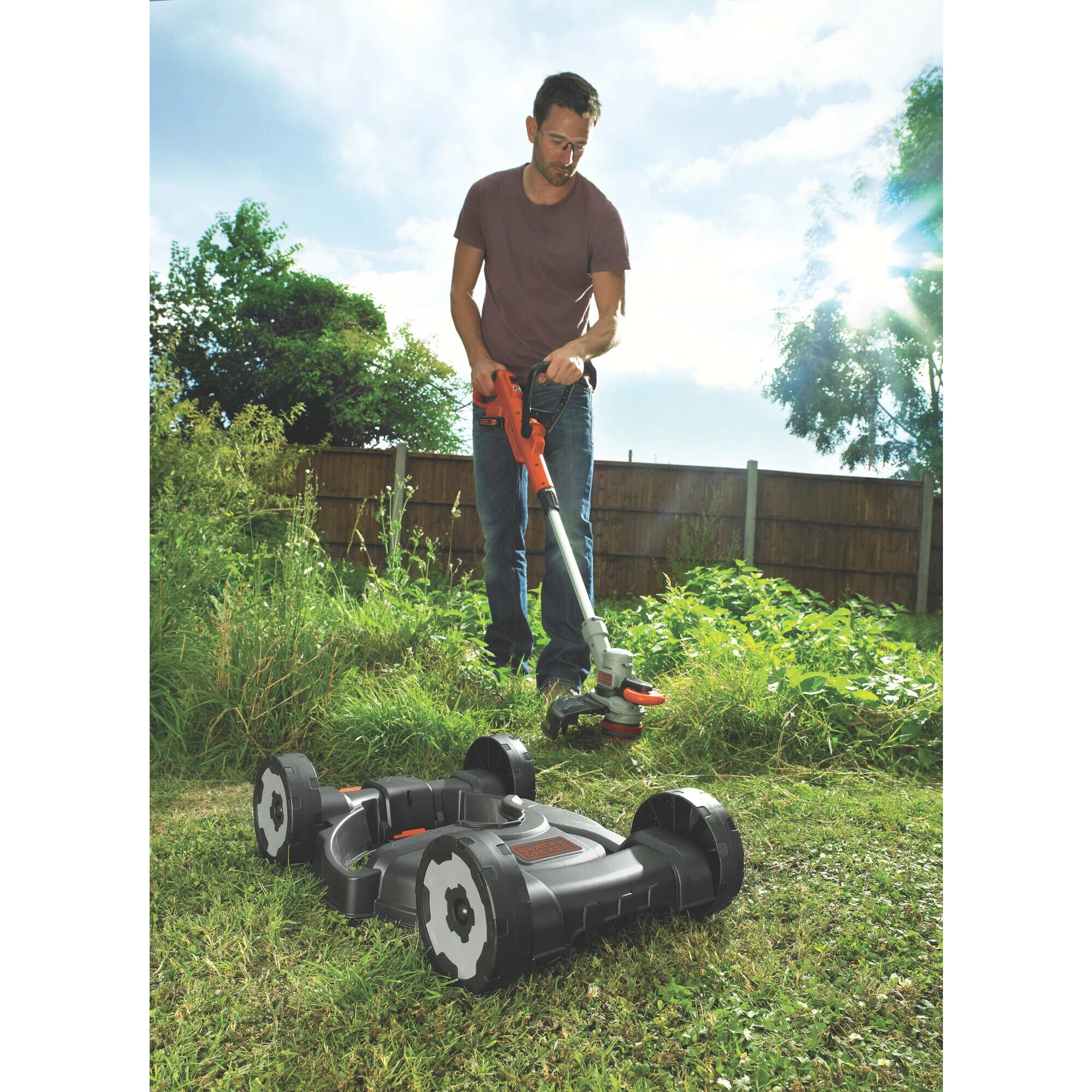 Der Black & Decker Akku-Multi-Trimmer STC1820CM ist ein 2-in-1 Multifunktionsgerät. Er lässt sich sowohl als herkömmlichen Rasentrimmer mit integrierter Kantenschneidefunktion mit Führungsrad, als auch als Rasenmäher mit entsprechendem Aufsatz verwenden. Der Rasentrimmer wird einfach auf die Basis aufgesetzt, für gleichmäßigen Schnitt größerer Rasenflächen. Zum Lösen verfügt die Basis über einen Fußraster. Darüberhinaus kann der Akku-Multi-Trimmer STC1820CM seine Schnitthöhe von 40 – 60 mm verstellen. Dank einer Schnittbreite von 28 cm eignet sich der Akku-Multi-Trimmer STC1820CM auch für größere Rasenflächen.