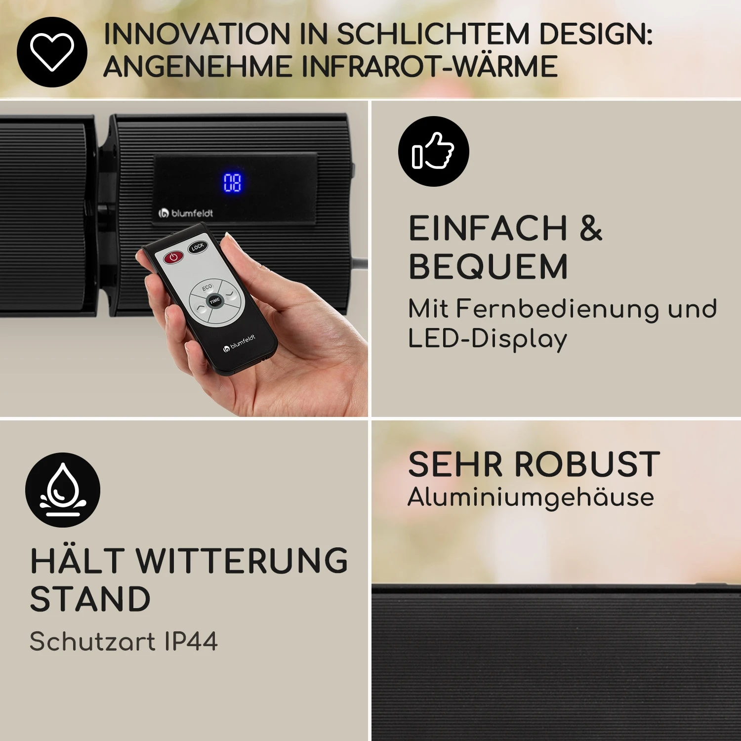 - IR Comfort Heat-Technologie: gezielte Wärmeabgabe an Personen und Gegenstände und nicht an die Umwelt