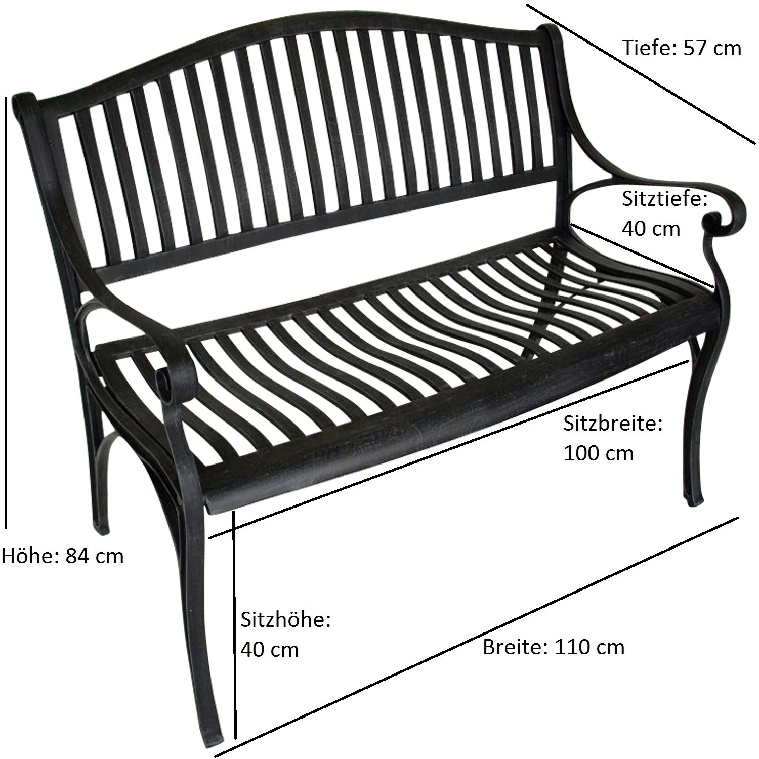 Maße: Breite 110cm, Sitzbreite 100 cm, Tiefe 57cm, Sitztiefe 40cm, Sitzhöhe 40cm, Höhe gesamt 84cm, Sitz- und Rückenteil mit vertikalen Verstrebungen, ergonomisch geformt.