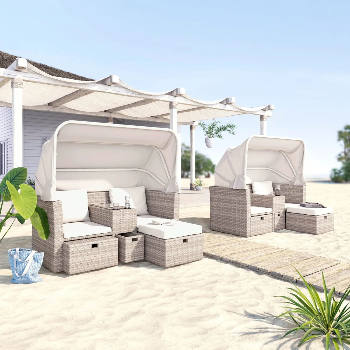 - Gartensofa im Strandkorb-Look mit Sonnenschutz, ausziehbaren Fußteilen und Kühlfach