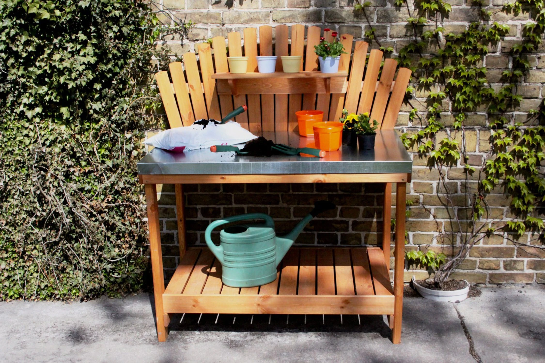 Der ideale Arbeitsplatz für Hobbygärtner: Dank der über den Rand gearbeiteten Zinkfläche, können Sie nach getaner Arbeit schnell wieder Sauberkeit und Ordnung herstellen. Dabei unterstützen Sie die leicht erreichbaren Ablagen und die große Schublade. Große Übertöpfe und Blumenerde finden beispielsweise unter dem Tisch Platz.