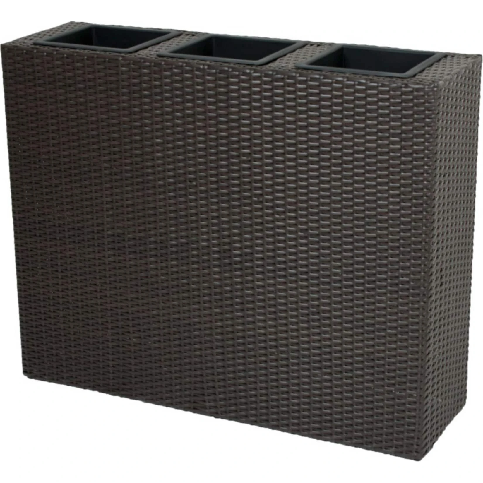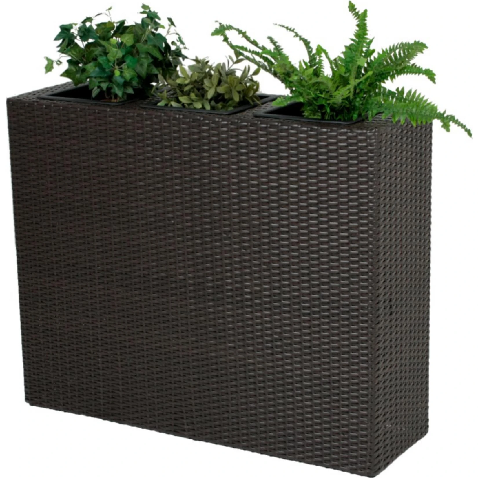 Raumtrenner mit 3 Pflanztöpfen Material: Stahl / Kunststoffgeflecht coffee Maße LxBxH cm ca.: L100xB30xH80 cm Zusatzinfomationen: Rahmen aus Stahl Einsätze für Pflanzen aus Kunststoff Einsatz: L24,7xB24,7xH20 cm